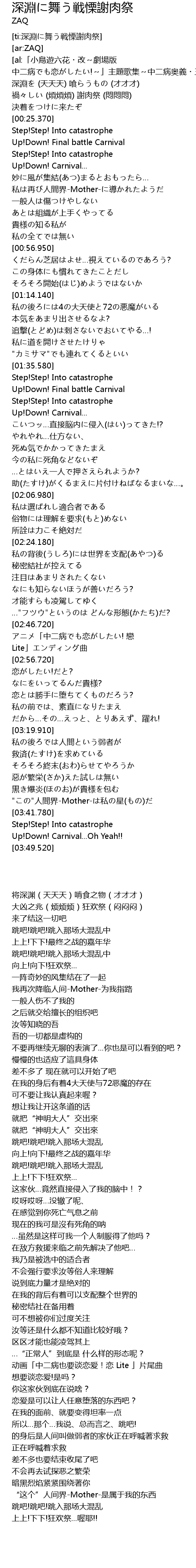 深淵に舞う戦慄謝肉祭 Shen Yuan Wu Zhan Li Xie Rou Ji Lyrics Follow Lyrics